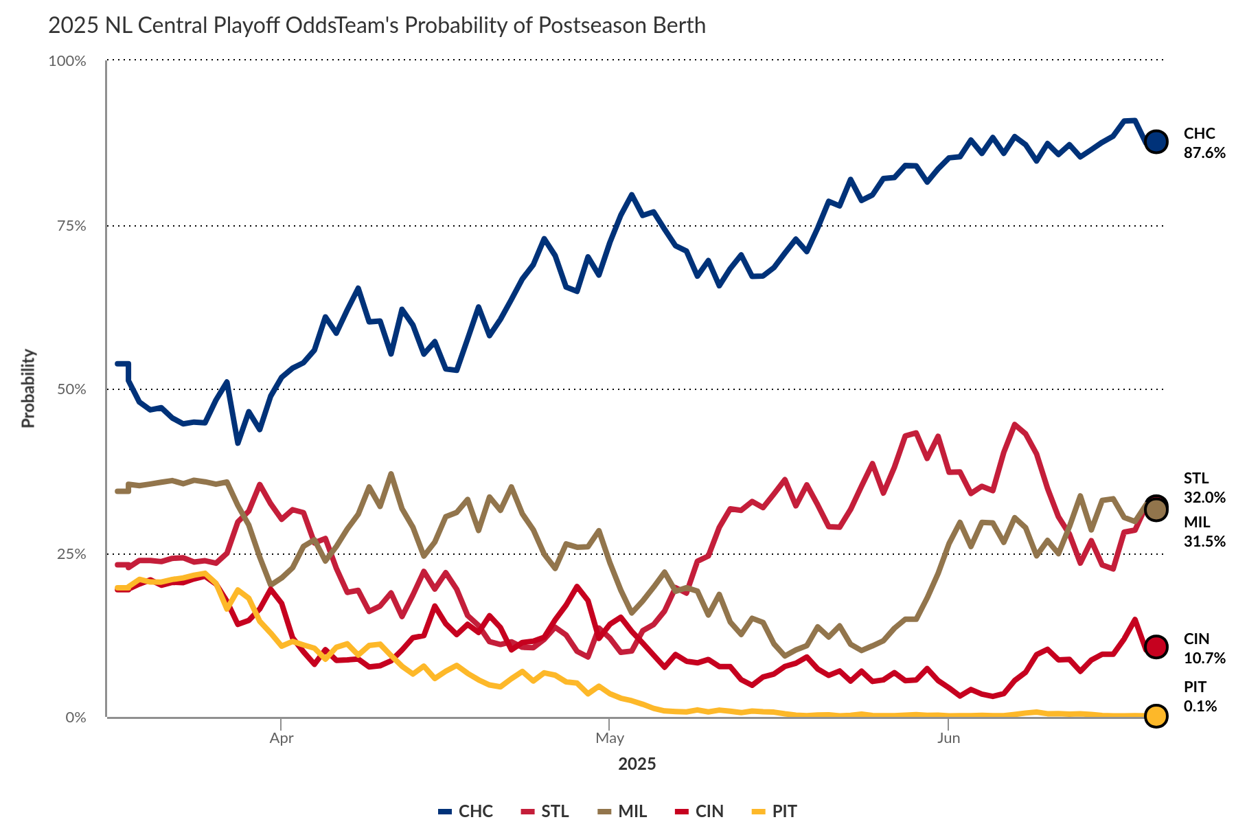 Okay, not every season shows the Cubs going wire-to-wire as favorites to win the division. But that’s what we see above, and the gap between them and their two closest rivals continues to grow. They’ve got a big chance to increase that distance further with four games in St. Louis beginning Monday and another three back at Wrigley over Fourth of July weekend.