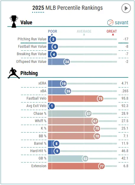 The big righty’s Baseball Savant page illustrates the disparity in his performance all too clearly, with almost everything either well above or well below the 50th percentile. His fastball velo is good and plays up due to his extension; he gets lots of whiffs and strikeouts without walking too many; and he generates a decent number of grounders. But Brown also serves up barrels like a bourbon distillery, leading to far too much hard contact.