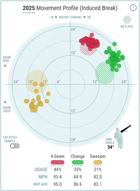 That was a major focus with Shōta Imanaga, who also possesses a high-ride fastball that he used to locate lower due to NPB’s adjudication of the zone. The lefty did a better job of working higher in his first season, but the four-seam was thrown almost a full tick slower with just over an inch more drop in 2025. It also had a bit more arm-side run. The result was a four-seamer that went from the 68th percentile in run value to the 10th, leaving Imanaga unpitchable late in the postseason.