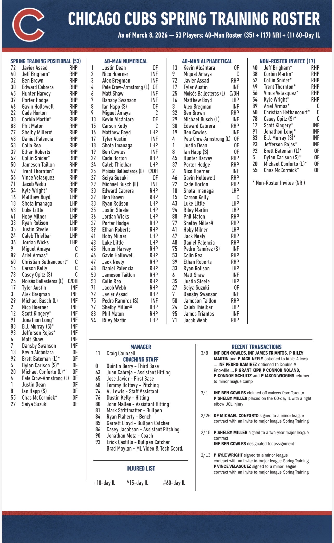 Chicago’s Spring Training roster of 53 players consists of 28 pitchers (six non-roster invitees), six catchers (three non-roster invitees), 10 infielders (four non-roster invitees) and nine outfielders (four non-roster invitees).